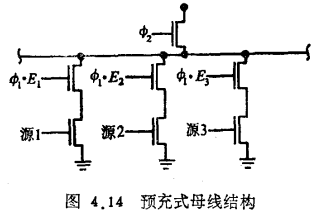 其他运算器电路母线(Bus)结构及基础电路解析母线(Bus)运算器内各部分之间的数据传输必须通过公共的数据母线。一种电路简单的预充式母线如图4.14所示。由上述可知,ALU在ф2期间进行运算,ф1期间向外输出,因此可以利用ф2对母线预充,ф1期间向母线传输数据。其中Ei为选数据源的控制字,由它决定运算器中哪一部分向母线传输数据。这种结构并不要求数据源具有三态能力,因为它由,ф1·Ei,控制的门管进