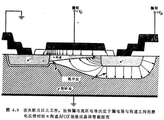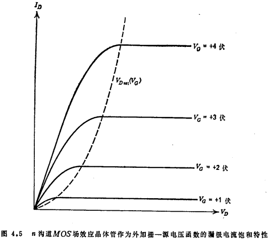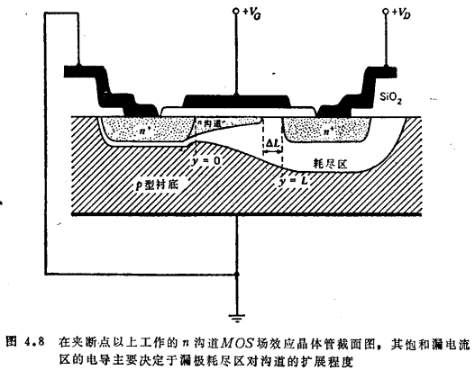饱和漏电流区的电导在前一节中,已经证明当栅-源电势保持常数,而漏极电压从零开始增加时,漏-源微分电导逐渐减小,直到电流达到饱和。在一级近似范围内,如果漏电压大于,而小于漏极二极管击穿电压(漏衬组成的二极管承受的反向偏压),则漏-源电流与外加漏极电压无关。参考图4.4,即不难理解漏-源电流饱和的物理基础。如图4.4(a)所示,对于用的中等高电阻率衬底制作的n沟道MOS场效应晶体管,在外加正值栅压(+