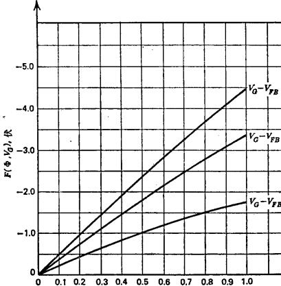 MOS场效应晶体管作为栅压函数的饱和漏电流的关系将(4.26)代入(4.14)可以将饱和漏-源电流表示成外加栅-源电压函数的形式。结果是而可以表示成式中函数F(ф,VG)定义为栅压减平带电压取三个不同的数值时,F(ф,VG)与ф之间的函数关系表示在图4.6中。(考察(4.27),显然F(ф,VG)总是小于或等于零。)结合(4.36)和(4.37)得到或对于用中等高电阻率p型衬底制作的n沟道MOS场