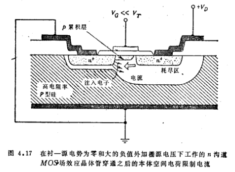 MOS管漏极耗尽区漏极耗尽区发生穿通效应后,由漏区到源区的空间电荷限制电流如果MOS场效应晶体管的漏源间距足够小,用以制作器件的衬底的电阻率足够高,与反偏压漏一衬结有关的耗尽区会随漏压增加而扩展,以致最后将同源一衬结的耗尽区联通。这个条件通常称为穿通,见图4.11所示硅n沟道MOS场效应晶体管截面图。在超出穿通需要不断增加正值的外加漏电压时,源区内的多数载流子,这种情形为电子,可以注入到耗尽沟道区