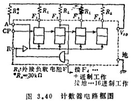 MOS集成计数器电路图工作原理前节的二进制触发器电路,输入一组“0”“1”的脉冲,也就是输入一位输入脉冲之后,输出才翻转。因此,可以得到重复1/2输入周期的输出。从而当这些触发器电路级联时,可以构成二进制计数电路,该电路从初级起各级具有20、21,22、…2n的二进制编码权。设输入脉冲的频率为fi,级联的级数为n,则最末级输出脉冲的重复频率为,为了得到任意的n进制计数电路,可向前级加反馈。在连成n