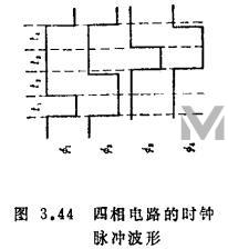 MOS集成电路多用两相时钟的电路方式,三相、四相等多相时钟电路也在进行研究。此处简单介绍大家最熟悉的多相时钟电路即四相时钟方式的逻辑电路。图3.43给出该电路的基本门电路,根据应加到端点的时钟信号可分为四类。图3.44表示出应加的时钟信号。在说明电路时.设所用的晶体管处于低电平L时为导通状态;处于高电平H时为截止状态。现以图3.43的第二类电路为例进行说明。