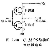 C-MOS逻辑电路.C-MOS(互补MOS)逻辑电路,C-MOS(互补MOS)逻辑电路以上各节叙述了单一沟道(P沟道或N沟道)MOS晶体管逻辑电路。此处对P沟道和N沟道组成的C-MOS结构的逻辑电路加以说明。该电路中,将P沟道晶体管的漏与N沟道晶体管的漏接在一起作为输出端,将两个晶体管的栅接在一起作为输入端。并且在P沟道的源上加正电压,在N沟道的源上加负电压。若在输入端加电压,当Vin=0时,P沟