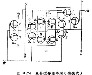 MOS存储器发挥其大容量的特点,被广泛地用于电子计算机的主存领域。本节将说明MOS被用于何种存储器,具有何种电路形式?下一节叙述实际构成存储器的方法。(1)MOS存储单元用只有P沟道(或N沟道)的单一沟道MOS构成的存储单元的例子,如图3.72所示。Q1~Q4构成触发器,Q5、Q6用用于线选通,在写入“1”时,向位线D输进正脉冲。向地址线上输进负脉冲,可使Q5导通,Q2截止。另外藉助