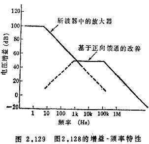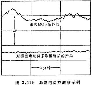 MOS晶体管斩波器的恒压性漂移是因室温起伏和周围空气的波动所产生的温差电动势。这种温差电动势主要是由MOS晶体管的引线与接触点之间的温度差所引起的。广泛用作晶体管密封管座引线的科伐线与铜线间的温差电动势,大约为27μV/℃。例如图2.113所示的并联型斩波器电路的A/B两点之间若有0.1℃的温度差,就产生27μV的温差电动势。此温度差经引线传递到MOS晶体管芯片上,就在源与漏电极间产生约几万分之一
