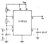 ICM7555内部电路图,ICM7555时基内部电路图及其功能分析 ICM7555内部电路图如图6.3-2所示。对应于图6.3-1,我们可以看出,图中M1~M4构成比较器1;M5~M8构成比较器2:M9~M13及倒相器组成R-S触发器;M16为放电管;M10~M15为互补输出级电路;3个100千欧姆电阻构成分压电路,其分压电压分别加在比较器1的倒相输入端和比较器2的同相输入端。ICM7555时基电