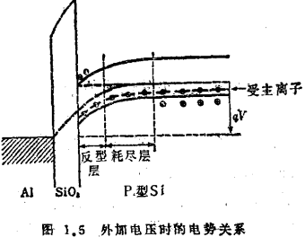 MOS场效应管的工作原理分为了讨论MOS场效应晶体管的工作原理,我们假定它有图1.4所示的简单结构。以N沟道的情形为例,当栅极加正电压时,垂直于硅表面方向的电势关系如图1.5所示。与栅极上感生的正电荷相对应的负电荷,除了在硅表面感生的电子之类的负电荷以外,还有在P型硅材底表面形成的空间电荷层中的受主离子之类的负空间电荷。首先,在此处忽略受主离子所形成的空间电荷的影响,认为与栅极感生的正电荷相对应的