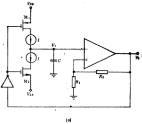 多谐振荡器电路,图6.1-1的实际电路图如图6.1-4所示。运放A1与M2构成负反馈回路它将输入电压image.png转变为电流I,并等于image.png/R。因此,该电路为压控(电压控制)振荡器。由图可知,M4、M5、M6和M7的电流等于M3的电流I,当M9导通,M8载止时,M1与M5构成电流源电路,因而M1电流为I;当M10导通、M11截止时,M2与M7构成电流源,M2的电流也等于I。显然,