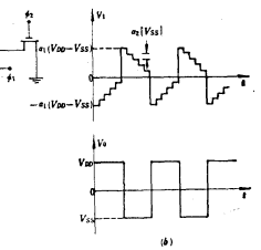 利用开关电容电路也可设计开关电容多谐振荡器,其电路如图6.1-5a所示。运放A1、A2与电容a1C构成正反馈回路,A1为积分器,A2为比较器。若比较器输出电压Vo限幅于负电源Vss时,开关电容a2C在每一时钟周期中,向积分电容C馈送正电荷image.png,这样,运放A1输出电压V1相应减小阶梯电压a2lVssl(见图6.1-5b)。如果下降到V1<0时,则image.png比较器输出电压Vo跳到