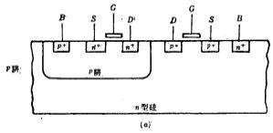 CMOS电路是由p沟道和n沟道两种类型的MOS场效应管构成的。我们可以把p沟道MOS场效应管制作在n型硅片衬底上,另外用硼离子注入到n型衬底上,形成一个p阱,把n沟道MOS场效应管制作在p阱里,如图4.1-1a所示。同样,我们也可以把n沟道MOS场效应管制作在p型硅片衬底上,而用磷注入到p型衬底上,形成一个n阱,把p沟道MOS管制作在n阱里,如图4.1-1b所示。图中G为MOS管的栅极,S为源极,