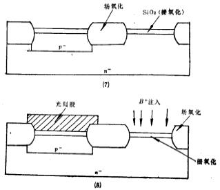 CMOS铝栅-硅栅,CMOS铝栅-硅栅工艺,1、p阱氧化和p阱光刻,在n型硅片上热生长一层SiO2,作为P阱离子注入的掩蔽层,氧化层厚度根据离子注入能量、剂量以及p阱再分布温度和时间来定,一般要求在5000埃以上。然后进行光刻,把P阱区的氧化层腐蚀掉。2、P阱硼离子注入和再分布,P阱是CMOS电路中n沟MOS管的衬底,P阱表面杂质浓度的大小,直接影响着n沟MOS场效应管的阈值电压,因此必须严格控制