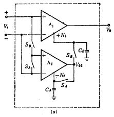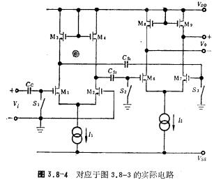 MOS运放的自动调零,在MOS模拟大规模集成电路中,作为主要部件的MOS运放,其电路结构越简单越好,以减小芯片的面积;但一般的MOS运放其失调电压都较大,约10~20毫伏,这样限制了它的使用范围。为了减低一般结构的MOS运放失调和漂移,我们可采用便于集成的自动调零技术,具体阐述如下。图3.8-3电路是失调电压自动调零的MOS放大器电路原理图。