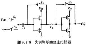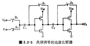 CMOS电压比较器工作原理,为提高电压比较器的灵敏度,可采用上一节介绍的失调自动调零技术,其电路形式如图3.9-3所示,该电路同本章第八节图3.8-5电路相似,其失调自动调零原理已作了说明,图3.9-3的电路是低失调电压比较器电路。下面简要介绍该电压比较器的工作原理。图中VR为基准电压,Vi>VR为输入信号电压。电路的工作状态可由双相时钟信号控制。第一种工作状态,当开关S1闭合,而S2断开的时候,