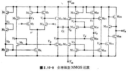 NMOS运放典型电路图1、全增强型NMOS运放全增强型NMOS运放如图3.10-9所示。构成输入级差分电路,其增益约5倍;image.png和image.png为电平位移电路,增益约0.95倍;image.png组成串级放大和输出级驱动电路,采用串级放大是为了减少M20栅极的密勒电容,以改善频率响应,这一级的增益等于image.png,约为11倍;image.png构成输出级电路,其形式如图3.1