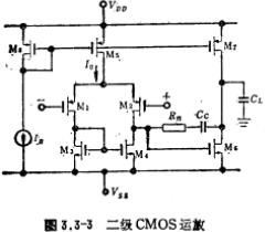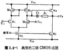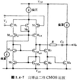 CMOS输出阻抗,图3.4-5是低输出阻抗运放。输出级采用甲、乙类推挽放大器,能驱动200欧姆的低阻负载。为减小失真,输出级在静态时处于微导通状态,其电流偏置由M6~M9来决定。M12作为等效电阻(1/gm1)与补偿电容Cc串联,以消除电路的零点,提高稳定性。本电路正如第二章所说明的那样,其缺点是输出幅度较小。