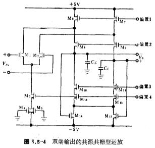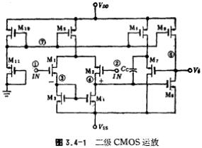 CMOS运放电路工作原理,电路中节点⑦的电位根据电路输出的正向电压最大幅度来确定,输出正向摆幅为5伏,管子的阈值电压为1.5伏,为保证放大器处于饱和区,节点⑦的电位取3.8伏,负向摆幅为-5伏,同样理由,节点③、④定为-5伏左右。节点⑤的电位可根据电路正向共模电压范围来确定,为获得最大正向共模电压,M5漏极的电位取2伏左右。由(3.3-15)式可知,运放最大的转换速率为
