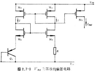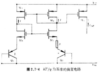 晶体管VBE电压为基准的偏置电路详解,VBE为基准的偏置电路如图2.7-3所示,图中的PnP晶体管Q1与CMOS管同时形成。由M1~M4构成的反馈回路,迫使流过Q1管的电流与流过电阻R的电流相同。由图可得如下关系式