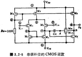 MOS运算等效电路,在双极型运放电路里,通常跨导gm较大,零点Z的频率远大于单位增益带宽GB,不会影响电路的稳定性,因而频率补偿电容image.png不会出现图3.1-2的情况。但MOS运放情况就不一样,因MOS管的跨导较低,频率补偿电容image.png所产生的零点Z较低,造成运放的不稳定,因此对MOS运放的频率补偿还要作进一步的讨论。