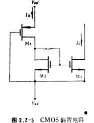 CMOS管的偏置电路,所谓CMOS偏置电路,就是将图2.3-1中的偏置电阻image.png,用P沟MOS管来代替,其电路形式如图2.3-5所示,在1CMOS运算放大器以及其他的MOS模拟电路中,偏置电路一般采用图2.3-5的电路形式。