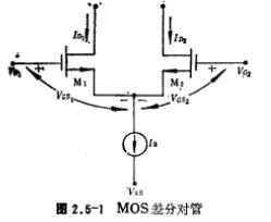 MOS管差分对管主要特性,MOS差分对管如图2.5-1所示。图中的M1和M2是完全对称(匹配)的,其工作电流(ID1、ID2)由电流源IO提供。输出电流ID1、ID2的大小依赖于输入电压的差值(VG1-VG2),但ID1和ID2之和恒等于电流源IO,在M1和M2的漏极分别接上电阻负载或MOS管有源负载,即构成差分放大器,由电流输出转换成电压输出,实现电压放大。