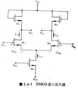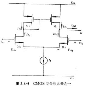 CMOS差分放大器,差分放大器的工作电流由电流源IO所提供。显然,这种电路工作原理同图2.5-3的电路是一样的,但衬底效应不同,如果CMOS工艺采用N型衬底,那么P沟MOS管的衬底一定要接在电路最正电位上(VDD),然而,N沟MOS管的衬底不一定接在电路最负电位(Vss),其方法是,N沟MOS管做在单独形成的P阱上,使P阱同MOS管的源极相连接,这样消除了衬底端置效应。如图2.5-3中的M;和M2