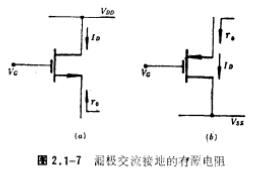 MOS场效应三极管连接方式的有源电阻解析1、源极交流接地图2.1-6a、b分别表示N沟,P沟增强型MOS管的源极交流接地·的有源电阻。(1)饱和区(VDS≥VG-VT)有源电阻ro为(2)线性区(VDS VG-VT)有源ro电阻为2、漏极交流接地图2.1-7a、b分别表示N沟、P沟增强型MOS管的漏极交流接地的有源电阻。根据小信号交流等效电路,很容易求得ro为工作在饱和区时,,上式可写为工作在非饱