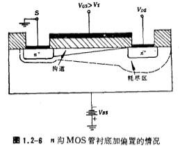 由许多MOS管所构成的MOS集成电路中,很多管子做在同一块衬底上,这时就不能把所有MOS管的源极与公共的衬底相连,势必有些管子的衬底相对源极加上了一个反向偏置电压image.png,由于image.png电压的影响,使增强型MOS管的开启电压增大,而使耗尽型管向增强型管的方向变化,n沟MOS管衬底加偏置的情况