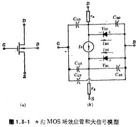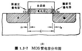 MOS电容模型,MOS管大信号模型(见图1.3-1b)中的五个电容,其image.png和image.png为image.png结势垒电容,image.png、image.png和image.png为栅极电容,这些电容分布如图1.3-7a、b所示,下面分两种类型来讨论它们的模型。