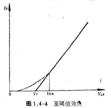 MOS管应亚阈值效应,亚阈值效应又称为弱反型效应。到目前为止,我们均假定当加在MOS管棚极上的电压超过阈值电压时,表面反型,沟道立即形成,这称为强反型近似。采用强反型近似模型计算阈值电压时,半导体表面势ф 等于费米势ф 1的二倍(ф=2ф 1)。根据强反型近似模型,漏源输出电流ID与VGS的关系如图1.4-4中的实线所示。实际上,弱反型区产生了电流ID,即当ф=2ф 1(VGS>VT)时,已经开