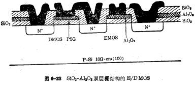 SiO2-AI2O3双层栅E/DMOS,由于AI2O3层内含有负电荷,可以抵消SiO2中的正电荷,因此可以控制SiO2和AI2O3的厚度比,从而使NMOS的阀值电压成为正值。图6-28是用SiO2-AI2O3。技术