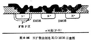 双扩散法制造E/DMOS双扩散法,简称DMOS工艺。衬底采用P-硅片(称为χ衬底),这样低浓度的P-型衬底,更容易制成N沟道耗尽型MOS器件。为了要制成增强型器件,可先在源区扩散硼,使其变成P区,然后再进行磷扩散,做成源、漏区。这样,从源到漏的杂质分布为N+-P-P--N+,增强型N沟道的阈值电压由扩散P区的杂质浓度决定,源漏之间的有效沟道长度,也由杂质扩散来调节。在源区没有进行P型杂质扩散的N沟