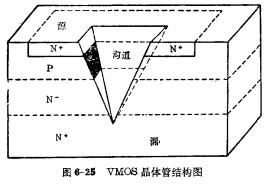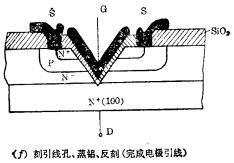 (1)一次氧化在以(100)面的N+-Si为基片的N-外延层上,生长一层二氧化硅掩膜。如图6-26(a)所示。(2)光刻、硼扩散硼扩散,形成衬底P区,扩散深度约为2μm左右。如图6-26(b)所示(3)光刻、磷扩散磷扩散,形成源区,结深约为1μm左右,并作低温淀积,生成二氧化硅保护膜。如图6-26(c)所示。(4)光刻、腐蚀V形槽光刻V形槽窗口,用水合联氨腐蚀V形槽。如图6-26(d)所示。(5)