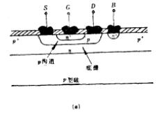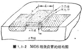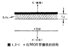 MOS场效应管的工作原理,用平面工艺制作的MOS场效应管,其典型结构图如图1.1-2所示,其中衬底材料为p型半导体,两个n+区由扩散工艺形成,分别称为源区和漏区。栅氧化层上面是金属电极,称为栅极.栅氧化层下面及源、漏之间的区城通常称为沟道区。源及漏区分别由金属欧姆接触形成S板、D极。MOS场效应管工作原理。衬底引出的电极称为B,通常B与源是短接并且接地,但有时也将源n+与衬底B之间加上反偏电压,此