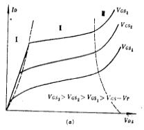 MOS场效应管的特性曲线,以n沟道增强型MOS管为例进行讨论。MOS场效应管在应用中有多种连接方式,最常用的是共源连接方式,如图1.1-7所示。图中源极与衬底相连接,信号由栅极G输入,经MOS场效应管放大后由漏极D输出。当GS电压VGS变化时,n沟增强型MOS场效应管的输出特性曲线如图1.1-8b所示。其转移特性曲线如图1.1-8b所示,它反映了漏源电流ID与栅偏压VGS的关系。图中VT称为阈值电