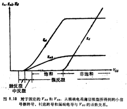 MOS晶体管低频小信号中反型工作原理及其特性在4.5节中已注意到,许多ID模型中忽略了中反型区,从而认为弱反型区和强反型区是紧挨的。这在预测ID时会导致某种误差,这一误差对若干应用来说是可以接受的。但是遗憾的是,在小信号参数中引起的相应误差通常是不可接受的,而且不论对模型参数选择什么样的经验值都不能使它减小。为举例说明这一点,我们选择gm作为例子, 并考虑VDS固定,VGS在较大范围内变化时这一