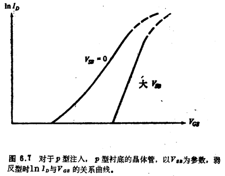 与衬底弱同型的注入沟道MOS晶体管特性现在,让我们简单地看一下弱反型特性。ID与VGS的关系曲线看来如图6.7所示。对于较大的VSB,耗尽区的边在注入区之外,器件特性与非注入器件的特性定性相似。斜率和以前一样,正比于1/n,n由式(4.6.20)给山,γ=γ2,且由式(6.2.11)给出。但是,对于较小的VSB,耗尽区的边在注入区之内,γ=γ1,并由式(6.2.4)给出,因而n就大,斜率就小。对于