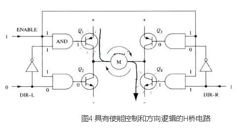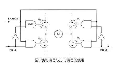 采用以上办法,电机的运转就只需求用三个信号控制:两个方向信号和一个使能信号。假如DIR-L信号为0,DIR-R信号为1,并且使能信号是1,那么三极管Q1和Q4导通,电流从左至右流经电机(如图5所示);假如DIR-L信号变为1,而DIR-R信号变为0,那么Q2和Q3将导通,电流则反向流过电机。