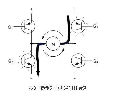 图3所示为另一对三极管Q2和Q3导通的状况,电流将从右至左流过电机。当三极管Q2和Q3导通时,电流将从右至左流过电机,从而驱动电机沿另一方向转动(电机四周的箭头表示为逆时针方向)。
