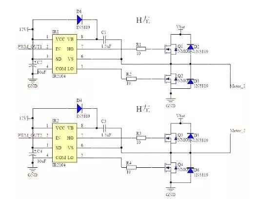 实践驱动电路中通常要用硬件电路便当地控制开关,电机驱动板主要采用两种驱动芯片,一种是全桥驱动HIP4082,一种是半桥驱动IR2104,半桥电路是两个MOS管组成的振荡,全桥电路是四个MOS管组成的振荡。其中,IR2104型半桥驱动芯片能够驱动高端和低端两个N沟道MOSFET,能提供较大的栅极驱动电流,并具有硬件死区、硬件防同臂导通等功用。运用两片IR2104型半桥驱动芯片能够组成完好的直流电机H桥式驱动电路,而且IR2104价钱低廉,功用完善,输出功率相对HIP4082较低,此计划采用较多。