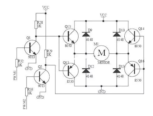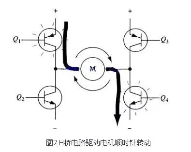如图所示,H桥式电机驱动电路包括4个三极管和一个电机。要使电机运转,必需导通对角线上的一对三极管。依据不同三极管对的导通状况,电流可能会从左至右或从右至左流过电机,从而控制电机的转向。