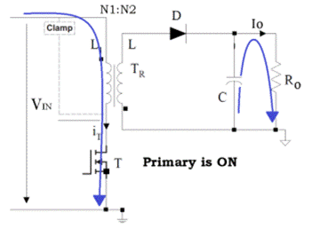 Q1导通时,变压器初级电感存储能量,输出续流二极管Dfly反向偏置,Cout输出能量给负载;