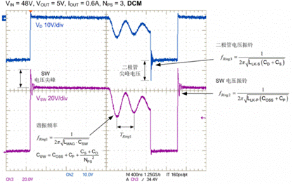 在DCM模式下,当MOS管关断,且在次级反射电流消耗为0之前,次级线圈输出相位的电压高于实际输出电压;当反射电流消耗为0,即次级线圈电流消耗为0时,实际输出电压由输出电容提供,此时次级输出相位的电压等于0,在次级输出相位电压由高于输出电压到等于0的变化过程中,会出现电压的衰减振荡,而该衰减振荡会耦合到初级线圈并加载在MOS与线圈连接的开关节点处。