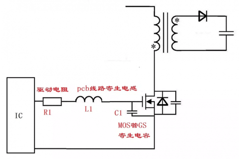 在图2中,IC出来的波形正常,到C1两端的波形就有振荡了。实际上,这个振荡就是R1、L1、C1三个元器件的串联振荡引起的。其中,R1为驱动电阻,是我们外加的;L1是PCB上走线的寄生电感;C1是MOS管GS的寄生电容。