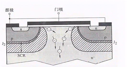 由于上图P阱与N-漂移区的PN结成反偏状态,于是产生了JFET效应,如下图。