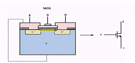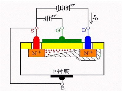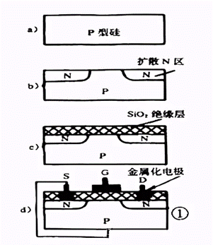 在P型半导体衬底上制作两个N+区,一个称为源区,一个称为漏区。漏、源之间是横向距离沟道区。在沟道区的表面上,有一层由热氧化生成的氧化层作为介质,称为绝缘栅。在源区、漏区和绝缘栅上蒸发一层铝作为引出电极,就是源极(S)、漏极(D)和栅极(G)。
