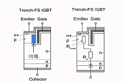 为了减小上述电阻,并且提高栅极面积利用率,沟槽栅IGBT变成主流,作用效果如下图。