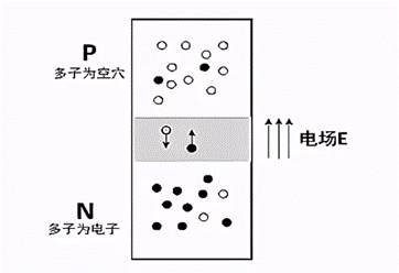 PN结原理如下图,空穴和电子的扩散形成耗尽层,耗尽层的电场方向如图所示: