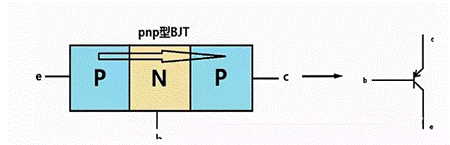 双极性晶体管,俗称三极管。内部结构(以PNP型BJT为例)如下图所示。