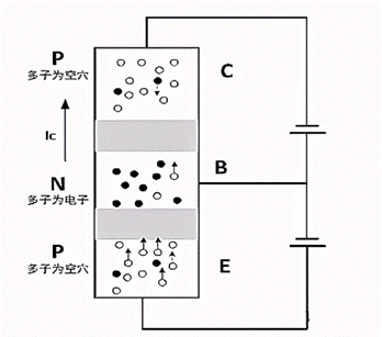 上图中,发射结正偏,空穴大量进入基区,他们在基区身份仍然是少数载流子的身份,此时,如前所述,这些注入的少数载流子很容易通过反偏的PN结——集电结,到达集电极,形成集电极电流Ic。