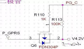 来看这个电路,控制信号PGC控制V4.2是否给P_GPRS供电。此电路中,源漏两端没有接反,R110与R113存在的意义在于R110控制栅极电流不至于过大,R113控制栅极的常态,将R113上拉为高,截至PMOS,同时也可以看作是对控制信号的上拉。当MCU内部管脚并没有上拉时,即输出为开漏时,并不能驱动PMOS关闭,此时,就需要外部电压给予的上拉,所以电阻R113起到了两个作用。R110可以更小,到100欧姆也可。